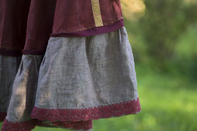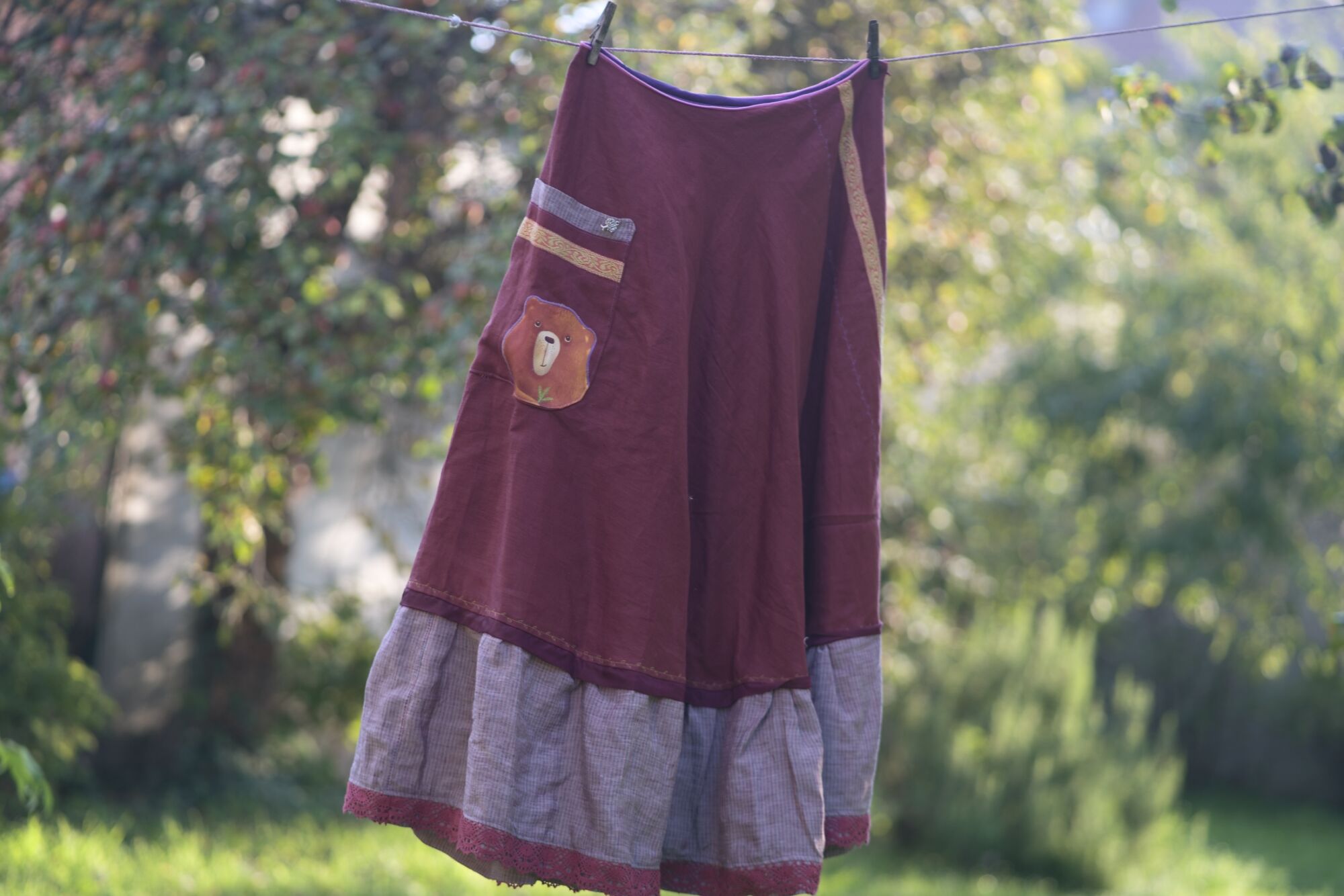Sukně je půlkolová, nosí se ideálně lehce spadlá na boky. Velikost na míru.  Délka maxi. Vnitřní hebká spodnička má krátkou délku.