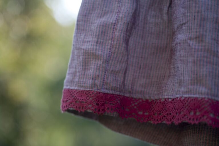 Ušito ze lnu. Vnitřní vrtsva (ta která se dotýká kůže) je čarodějně fialové hedvábné plátýnko (směs hedvábí/bavlna). Dozdobeno krajkami, stužkami, drobnou kavčí výšivkou a hlavně autorskou aplikací, kteroužto seženete jen a jen u kavek a jejíž autorkou je Majda Malované židličky.
