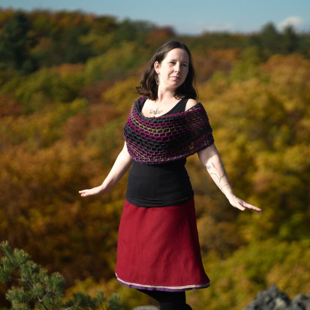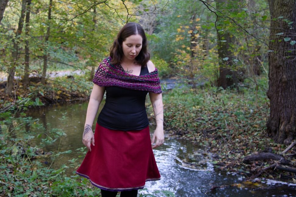 Vlněná sukně v délce ke kolenům. Áčkový střih, lehce projmutý, tvarováno zápoševky. Ušito z luxusního silnějšího vlněného flauše (100% vlna) spodní vrstva je barevně sladěné temně fialové hedvábí (hedvábí/bavlna).