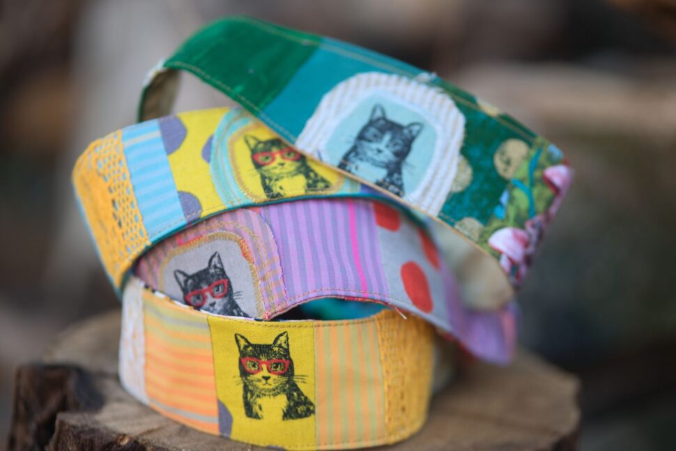 ...posešíváno z těch nejkrásnějších látek (vše 100% bavlna nebo směs bavlna/len), doplněno kočíčí aplikací z Echina a stužkami. Vzadu pěkný zelenkavý kanafas. Vyztuženo pevným balvněným plátnem. Gumička na upravení velikosti.